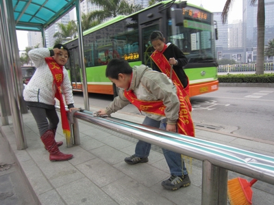 队员们拿着扫帚、拖把、水桶、抹布等劳动工具,有的在扫地、在擦洗花圃栏杆,有的在拾捡白色垃圾,有的清理公车站的小广告、有的在擦公车站的站牌和等候座位等等。在活动中,同学们不怕脏、不怕累,个个热情高涨,干劲十足,行动之处,时刻展现着新时代的“雷锋”新形象,他们的行动也得到了市民们的好评。