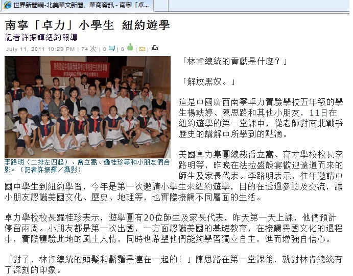 我校首批师生赴美交流团于2011年7月10日到达美国进行考察学习,期间我们与当地公办学校弗朗西斯刘易斯学校的老师和学生们一起学习、交流,一起参观农场,真正体验了美国学生的学习生活。在美国考察期间,我们还参观了自由女神、帝国大厦、大都会博物馆、自然历史博物馆、航天航空博物馆、航空母舰等,并参观了哥伦比亚、耶鲁、哈佛、麻省理工等著名大学。此行得到了当地学校的热烈欢迎,同时也引起了纽约当地媒体的广泛关注,纽约时报、侨报、美国中文网等都在报纸和网站上对活动进行了报道。此次赴美交流学习13天,我校将对本次活动进行分期报道。